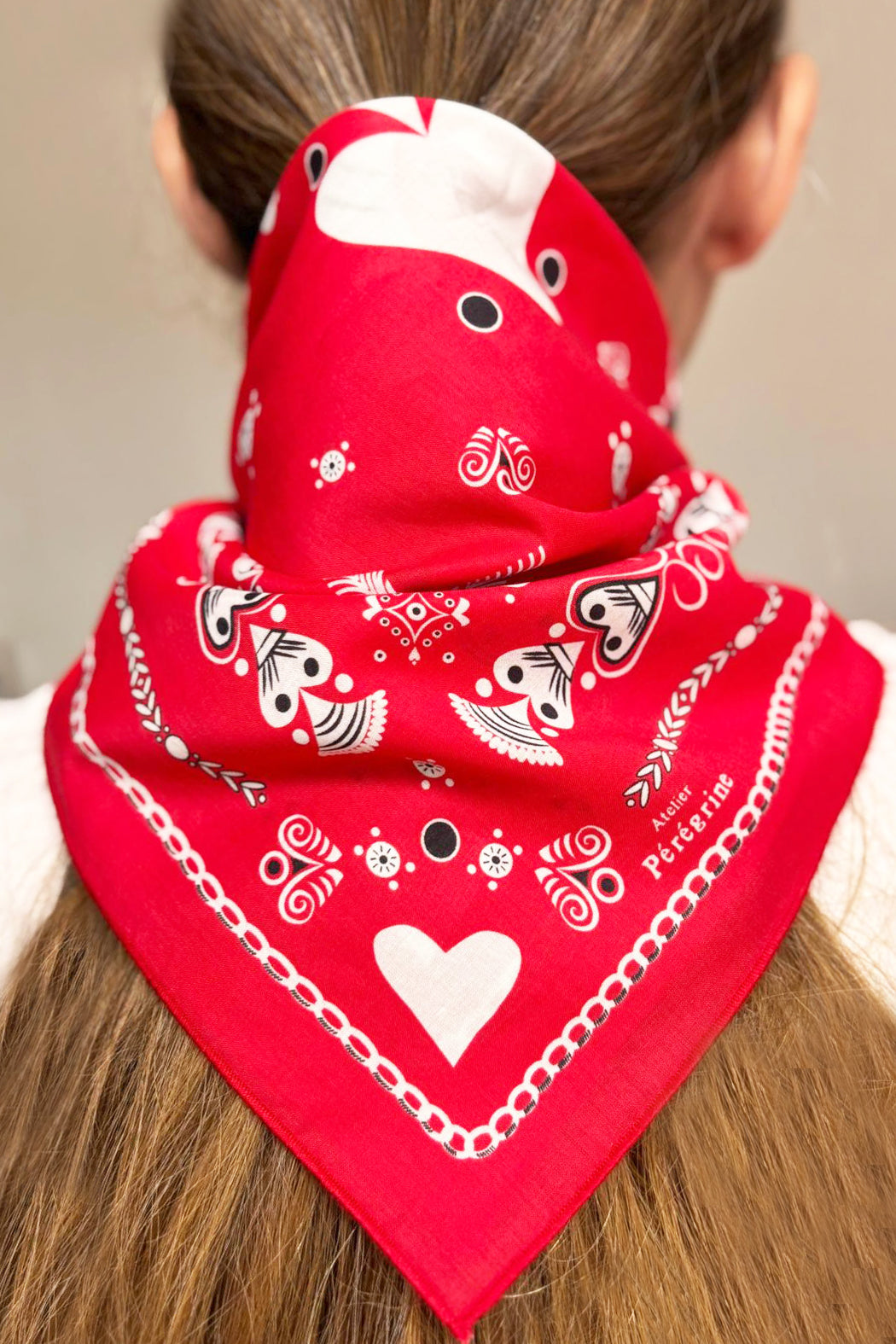 Une version dans un rouge lumineux pour se nouer autour du cou, des cheveux, accessoiriser un sac. Ruz signifie rouge en breton.